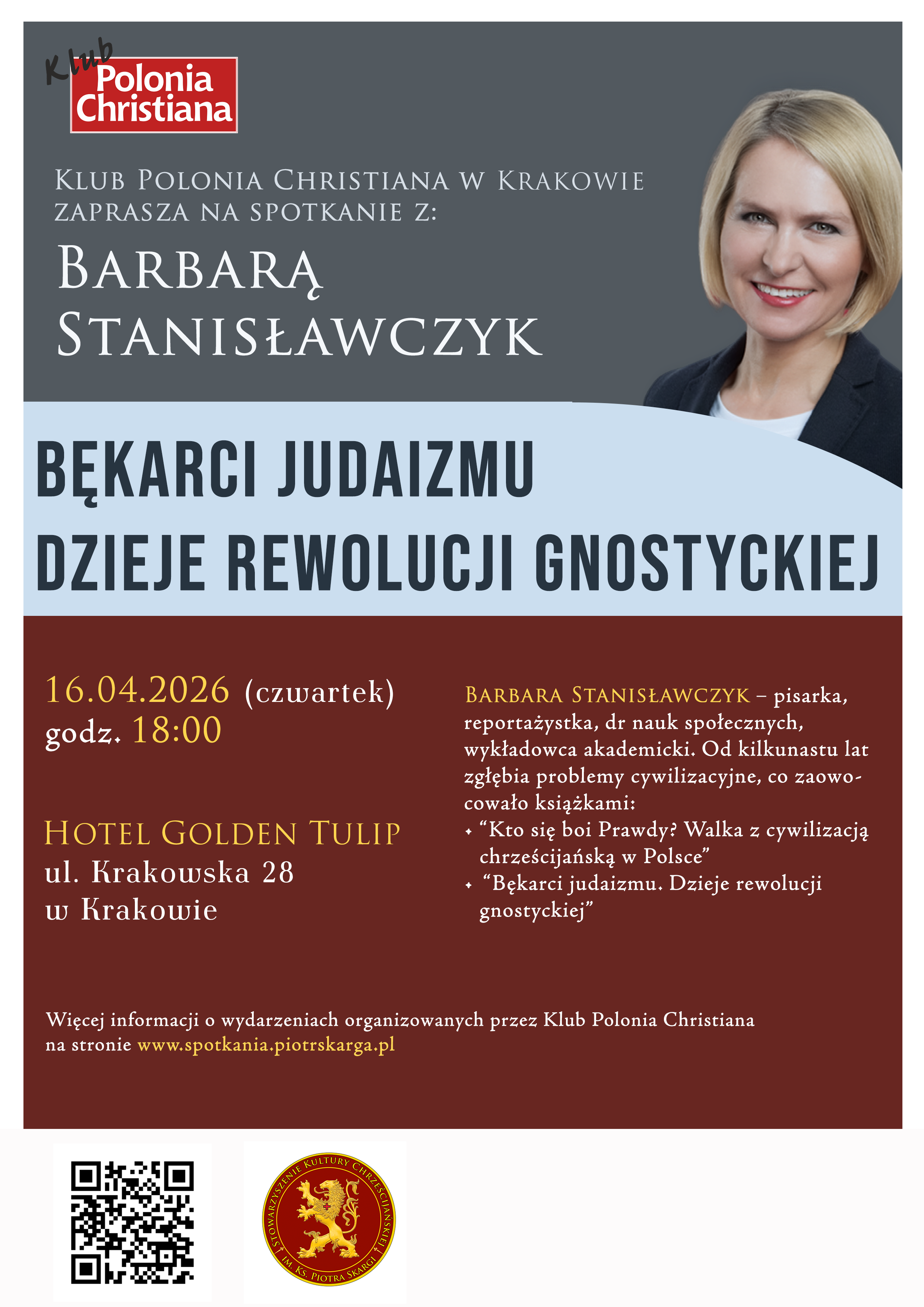 Klub „Polonia Christiana” w Krakowie zaprasza na spotkanie z dr Barbarą Stanisławczyk poświęcone jej najnowszej książce pt. „Bękarci judaizmu. Dzieje rewolucji gnostyckiej”.